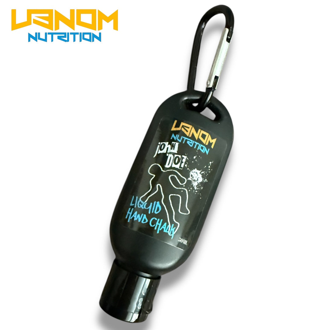 Introducing V3NOM's "John Doe" Liquid hand chalk! Easy to use, quick pop top and clip to easily clip to your gym bag so your not digging to the back looking for it.